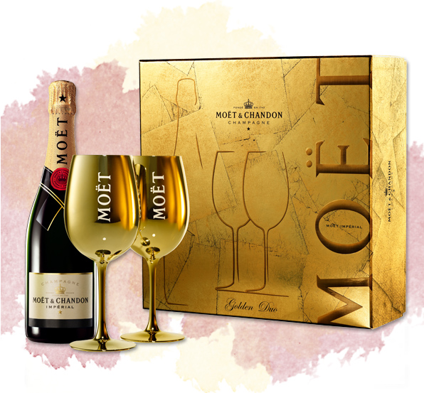 Geschenkbox Moët & Chandon «Golden Duo» mit zwei Gläsern und einer Flasche Moët Impérial ab heute exklusiv bei Globus und auf www.leshop.ch ab 89.– Franken