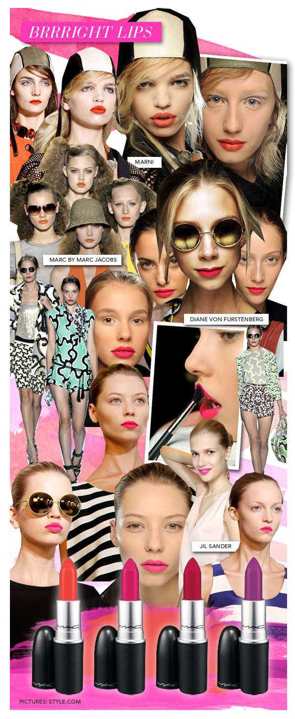 Bright Lips, z.B. mit den Stylishly Yours Lippenstiften von M·A·C Cosmetics, erhältlich in den Farben Neon Orange, Something New, Cockney und Style Curve zu CHF 28.–, weitere Infos auf www.maccosmetics.ch, und jetzt auf zum Uber Bright Lips Schminkkurs bei Lisa Eldridge: