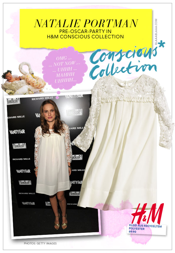 Haben wir nicht alle erwartet, dass der Schwan in Erwartung den goldenen Mann für Black Swan bekommt? Eben. In was Natalie Portman allerdings zur Pre-Oscar Party in Hollywoods Bar Marmont erschien, dann eher nicht, tataa, dat haste auch schon zig mal gesagt: 69.90 von H&M! Beim grossen Schweden in der Marketingabteilung hat’s wohl ebenfalls gleich Oscars und Beförderungen geregnet: Das Kleidchen stammt aus der neuen Conscious Collection, ist aus recyceltem Polyester, und meistert die schwangere Schwanenpartie gekonnt. Und dennoch denkt die Natalie auf diesem Bild gerade: Maah, war das wirklich eine gute Idee? Okay, vielleicht ist es auch ein simples: Maah, is mir grad rotzeschlecht!