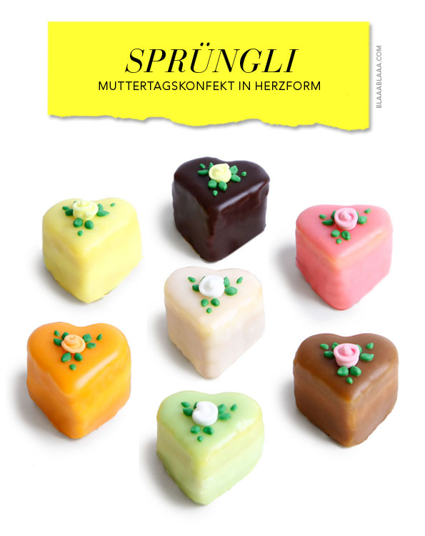 OMG, da haben wir den Salat, am Sonntag ist ja Muttertag! Der kommt aber auch immer so unerwartet schnell, kaum guckt man sich mal nicht um, zack, Kind, was bringst denn du der Mutti mit? Heureka, Herzlikonfekt! Was für ein herzerfrischender Zufall, bei der Confiserie Sprüngli hat man irgendwie gewusst, dass auch dieses Jahr wieder Muttertag ist, und deshalb bekommt man das traditionelle Pariserkonfekt zur Feier in spezieller Herzform und mit süsser Dekoration. Das luftige Biskuit, gefüllt mit zarter Crème, umhüllt mit bunter Zuckerglasur, gibt’s in den Aromen Chocolat, Citron, Mocca, Haselnuss, Kirsch, Orange und Pistache, hmm, wenn es diese Schachtel unangerührt bis zu Mutti schafft, bist du ohni Witz das beste Kind, wo’s je hät git’s! Okay, eins wird man ja probieren können …