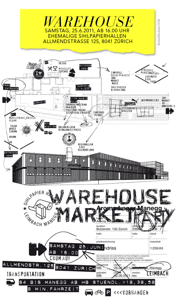 Am Samstag werden sich die ehemaligen Sihlpapierhallen Manegg (Allmendstrasse 125) einmalig und nur für einen Tag in eine Projektionsfläche für ein Spektakel verwandeln! Unter dem Namen WAREHOUSE gibt’s ab 16 Uhr (open end) einen grossen Markt mit Designerwaren, Sale, Flohmarkt- & Secondhandwaren und AROMA-Lagerverkauf. Outdoor wird um die Wette geschlemmt, in den übrigen Hallen wird man sich mit Sport, Kunst und einer offenen Bühne die Zeit vertreiben. Parallel und im Anschluss an den Markt gibt es Live-Performances, Openair-Kino, Feierabendathleten und ein Fest. Chum ine, s’heisst WAREHOUSE!