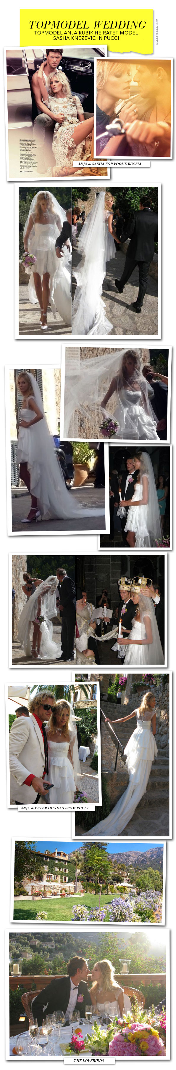 Phuu, mögen wir überhaupt noch Hochzeiten sehen? Pfff, das ist wie die Frage: Mag noch wer Sahnetorte? Also los, och ist das süss, sie modeln zusammen, sie geben gemeinsam ein Magazin heraus und nun haben sie geheiratet, das polnische Topmodel Anja Rubik und ihr longterm Modelfreund Sasha Knezevic, aka die Supernase, jesses, hat der ein Wahnsinnsprofil (apropos Wahnsinnsprofil: heute Abend geht’s auf SF2 weiter mit Vincent Cassel in «Public Enemy No. 1», schmacht)! So. Und jetzt. Zum Kleid. Da gab’s im Vorfeld ein Riesen-Tamtam, da es von Anjas ebenfalls longterm Gspusi, Peter Dundas, Creative Director bei Emilio Pucci, entworfen wurde. Vokuhila zur Hochzeit? Vorne kurz, hinten lang und obendrauf jede Menge Tüll? Na ja, mag noch wer Sahnetorte?