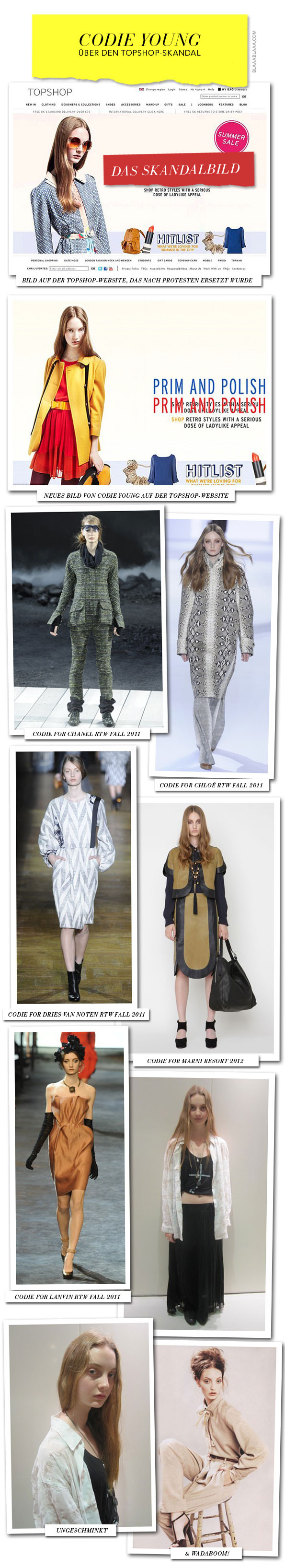 Bis vor kurzem war die 18-jährige Codie Young einfach ein weiteres Model auf dem Weg nach oben, frisch bei DNA, soeben von Australien nach New York gezügelt und gerade 39 Herbst-Shows gelaufen, darunter Marc Jacobs, Rodarte und Chanel. Doch nun, FLASH, das könnte der Karrierefunken sein, aber angenehm ist anders: Am 9. Juli publizierte die Daily Mail ein Bild von der Topshop-Website, man bezeichnete im folgenden Artikel Codie Young als «Skelett», «eingefallen» und «magersüchtig» und Experten diskutierten über ihre Essstörung. Dann aber bezog Young auf ihrem Blog Stellung, nun tut sie es im Interview mit WWD, und man muss sagen: Sie schlägt sich ganz schön tapfer! Trotzdem. Um es mit den Worten meiner Grossmutter zu sagen: Das Chind hät doch Würm!