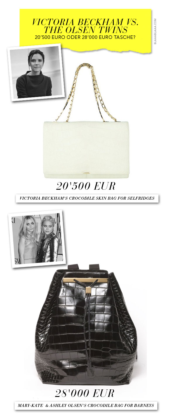 Victoria Beckham vs. The Olsen Twins, Vics Crocodile Skin Bag zu Weihnachten für 20’500 Euro bei www.selfridges.com, Crocodile Backpack von den Olsen Twins zu 28’000 Euro bei www.barneys.com