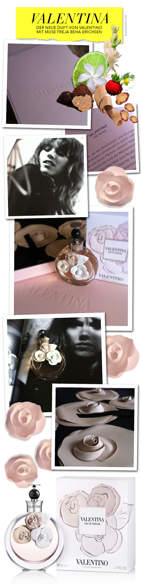 Als der Postmann heute zweimal klingelte, dachten wir, huh!, eine Waschmaschine!, ein Schrank!, ein … Moment, hat wer eine Waschmaschine oder einen Schrank bestellt? Doch siehe da, es war Valentina, das neue Parfum von Valentino, und da das letzte schon zwei Jahre her ist, hat man so richtig aufgedreht, das Flakon kam mit einem riesengrossen, wunderschönen Buch mit Papierseerosen und wunderbaren Fotos der bezaubernden Freja Beha Erichsen, welche mit ihrer sinnlichen, frechen Schönheit die Muse für den blumig-orientalischen Duft aus Bergamotte, weissen Albatrüffeln, Jasmin, Orangenblüten, Tuberose, Zedernholz, Ambra und wilden Erdbeeren ist. Und jetzt müssen wir das Paket nochmals genauer untersuchen: Freja? Hallo? Bist du da drin?