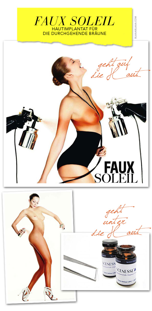 Nach Solarium, Selbstbräuner und Tanning-Kabine soll’s angeblich bald auch ein munziges Hautimplantätli sein dürfen, um sich täglich sonnengeküsst präsentieren zu können. Laut einschlägigem Revolver-Blatt bastelt die verruckte Forschung an einem Implantat, das die Haut dunkler erscheinen lässt. Ja merci dänn, Gigi Oeri wird’s mit Sicherheit freuen!