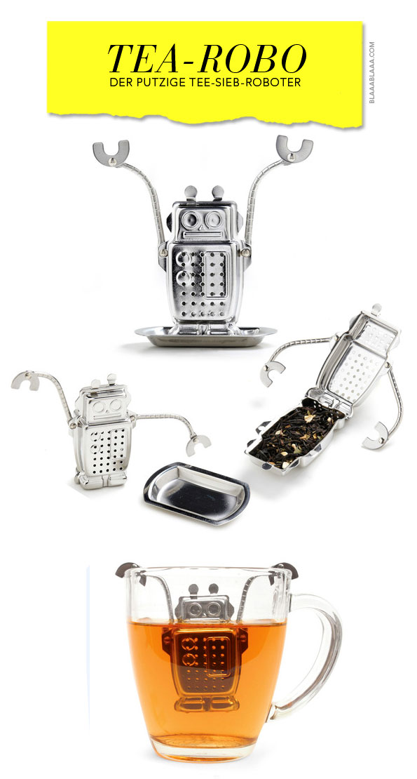 Hoooooch, ein Tee-Sieb-Roboter! Hoooch! Hooooch! Hoooch! Den könnte in Sachen Putzigkeitsfaktor nur noch ein puscheliger Hundewelpen schlagen. Aber in puschelige Hundewelpen kann man keinen Tee füllen. Und selbst wenn, da wär der ganze Tee voller puscheliger Hundewelpenhaare. Nene. Und jetzt nochmals alle: Hoooooch, ein Tee-Sieb-Roboter!
