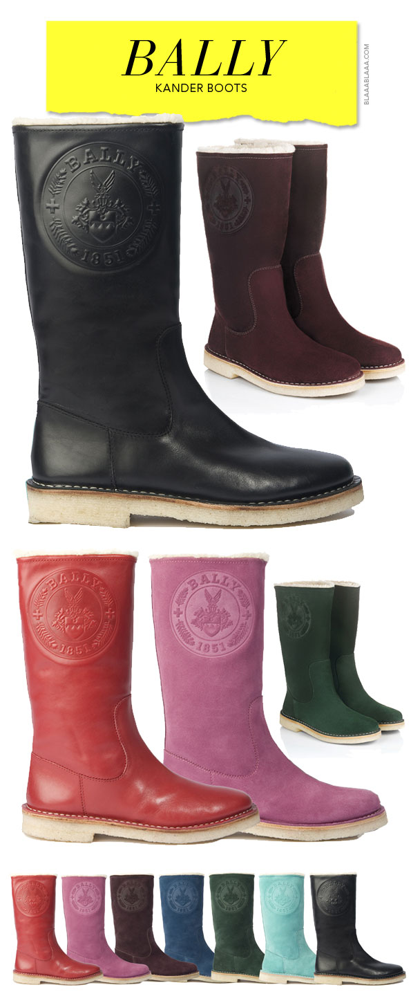 Ja aber Grüezi mitenand, endlich eine Alternative zu den australischen Lammfelltretern und zwar aus der Schweiz! Die Bally Kander Boots aus weichem Wildleder oder Leder sind mit flauschig wärmendem Lammfell gefüttert und mit der Bally Krone verziert, es gibt sie in Schwarz, Mokka, Aubergine, Himmelblau, Moleskin, Flaschengrün, Rot, Pfauenblau, Petunie und Schokobraun und … ja, der Preis. Der kommt auch aus der Schweiz.