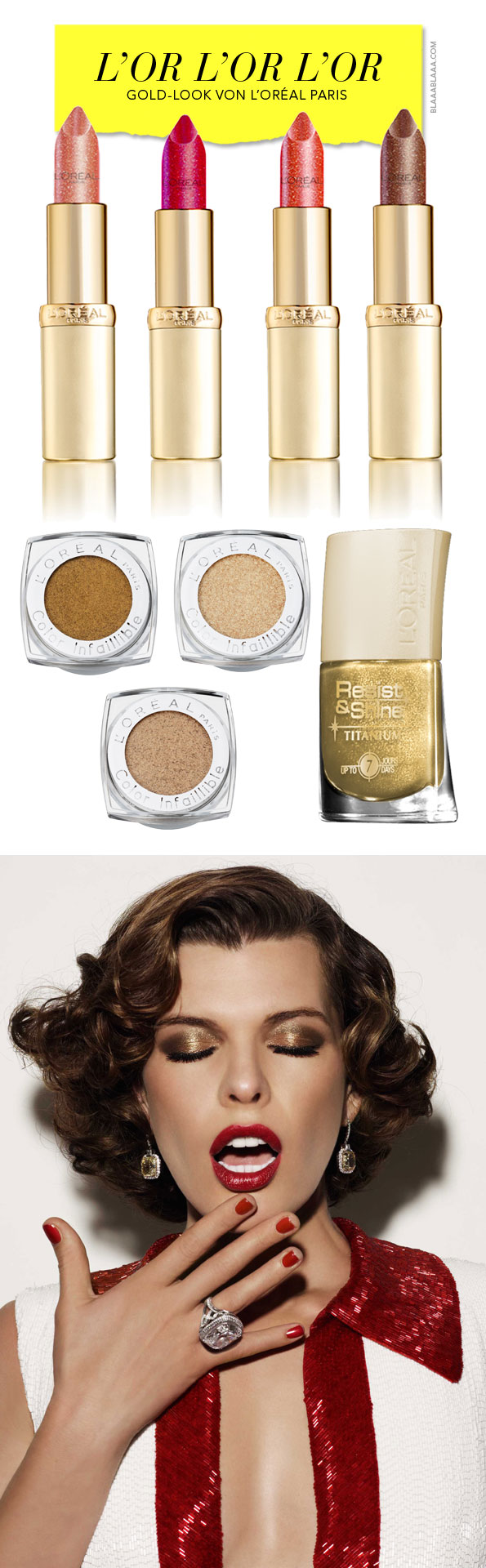 L’OR L’OR L’OR-Kollektion von L’Oréal Paris, Lippenstifte (CHF 20.90) und Lidschatten (15.90) erhältlich ab sofort, Goldmine-Nagellack (CHF 13.90) ab Dezember 2011, www.loreal-paris.ch