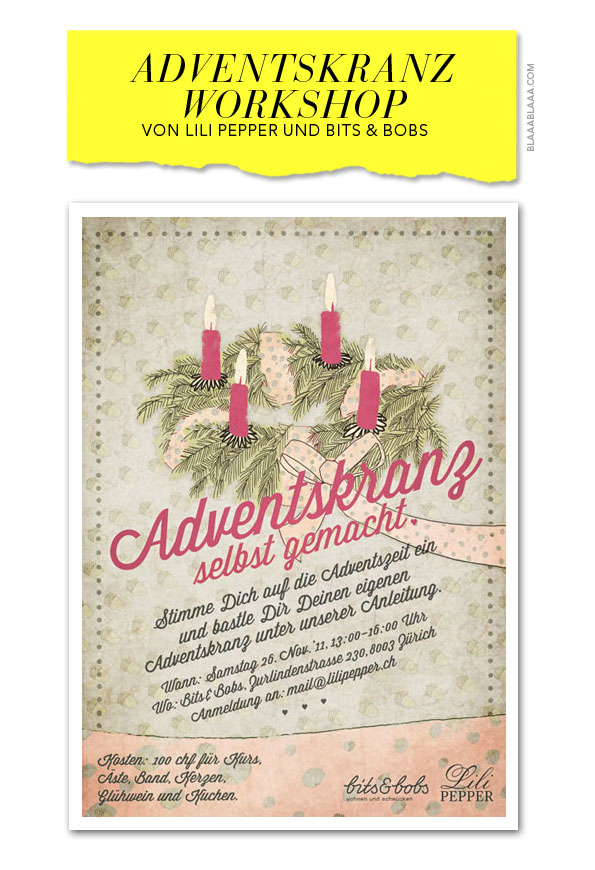 Adventskranz-Workshop, am Samstag, 26. November 2011, 13 – 16 Uhr im Bits & Bobs, Zurlindenstrasse 230, 8003 Zürich, Kosten: CHF 100.– inkl. Material, Kuchen & Glühwein, Anmeldung bis 18. November per E-Mail, alle Infos auf www.bits-and-bobs.ch