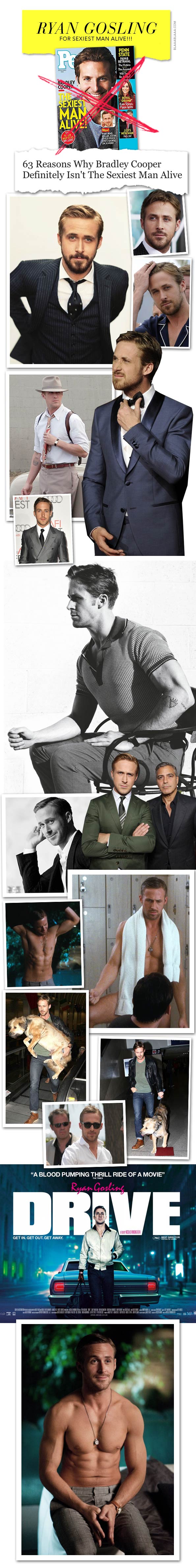 Bradley Cooper ist The Sexiest Man Alive 2011??? WHAT? Bitte, wie? Was ist denn da beim People Magazine passiert? Nein. Nein. Nein. Und nochmals: NEIN! Dieses Jahr kann es nur einen geben. Nur. Einen. Ryan-verflucht-nochmals-bist-du-ein-geiler-Kerl-so-sensibel-und-gleichzeitig-so-knallhart-ab-dir-läuft-uns-jedes-Mal-die-Küche-voll-Gosling! Ryan-wir-lieben-dich-seit-wir-mit-dir-in-The-Notebook-knietief-in-der-Sülze-standen-Gosling. Ryan-und-seit-Crazy-Stupid-Love-biste-ja-so-schnuckig-auftrainiert-you-are-fucking-hot-Gosling. Ryan-und-seit-Drive-wollen-wir-bei-und-auf-dir-mitfahren-Gosling. Okay, wir könnten stundenlang so weitermachen, und das tun wir auch gleich bei BuzzFeed, denn da sieht man das exakt genauso und liefert 63 wirklich, wirklich gute Gründe, weshalb es nur einen geben kann: RYAN GOSLING!