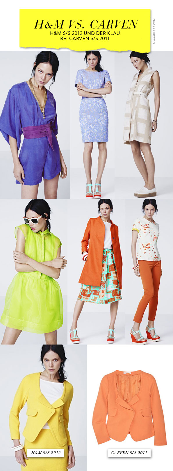 H&M stiehlt bei Carven, in Aprikose das Jäckchen aus der Carven S/S 2011 Kollektion, in Gelb doch mit sehr ähnlichem Schnitt in der H&M S/S 2012 Kollektion, www.hm.com, mehr vom Original auf www.carven.fr