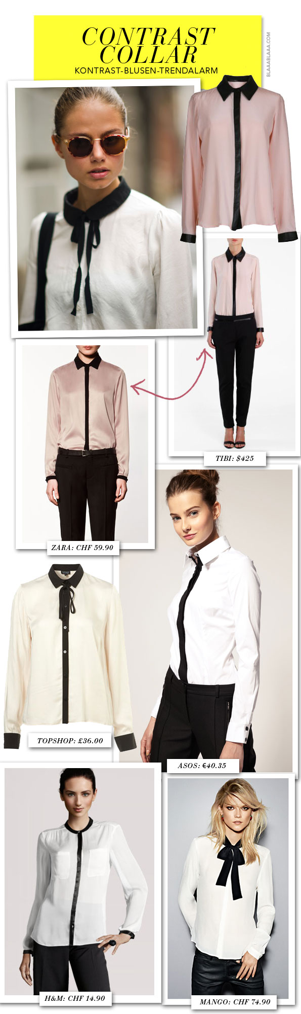 Jetzt geht’s an den Kragen, hier gibt’s die Blusen mit den Kontrast-Details: das Original von Tibi zu $ 425 auf www.tibi.com, zu CHF 59.90 bei www.zara.com, mit kleinem Mäschli zu £ 36 bei www.topshop.com, mit Kontrast-Knopfleiste zu € 40.35 bei www.asos.com, die Schwedenvariation zu CHF 14.90 bei www.hm.com und nur mit Masche zu CHF 74.90 bei shop.mango.com