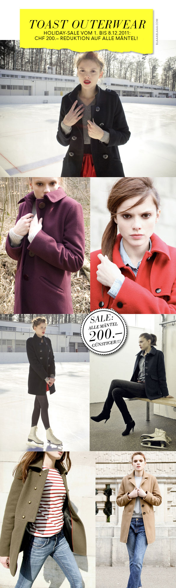 Ja läck du mir am Tschöpli! Susan Niffenegger und Roger Zeller von Toast Outerwear gewähren auf alle ihre wunderbaren Mäntel (auch auf bereits reduzierte Ware) eine einmalige Reduktion von CHF 200.–! Aufgepasst, mein fröstelndes Adventszweigli, der grosse Holiday-Sale läuft aber nur vom 1. bis zum 8. Dezember 2011 und kann aber praktischerweise auch bequem über’s Internet erledigt werden. Na dann, 3, 2, 1, meins! Äh, deins!