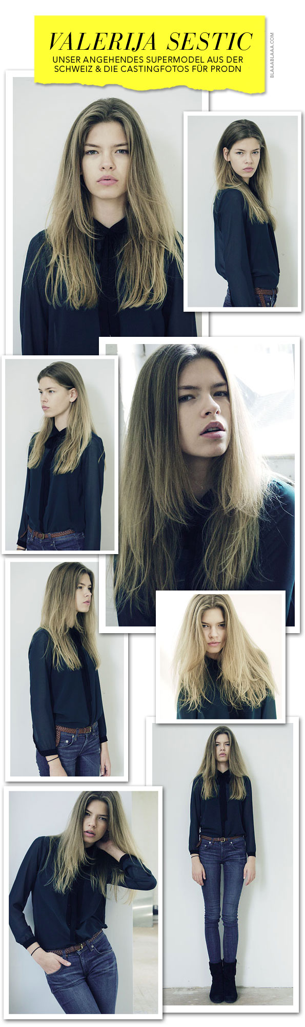 Da die Julia Saner ja einfach nicht mehr so richtig will, hat die Schweiz momentan nur noch ein richtiges Fäschn-Pferdchen im Rennen, aber hey, was für eins! Genau, Valerija Sestic, die schöne Schweizerin mit kroatischen Wurzeln und dem Zu-jung!-Skandal (zum Artikel), ist ja mittlerweile unskandalöse 16 und neu bei PRODn, das ist eine Produktions-Agentur, die so ziemlich alle dicken Fische macht, z.B. die Anzeigen von Prada, Louis Vuitton, Lanvin, Balenciaga, Jimmy Choo, Bally, Alexander Wang und, und, und. Und jetzt ist eben unsere Valerija da auch in der Kartei, das sind ihre Casting-Fotos und – ach, haste auch gleich Eiskunstlauf-Mama-Gefühle? –, Valerija, das kommt gut! Na, wenn da nicht bald der dicke Schotter rollt.
