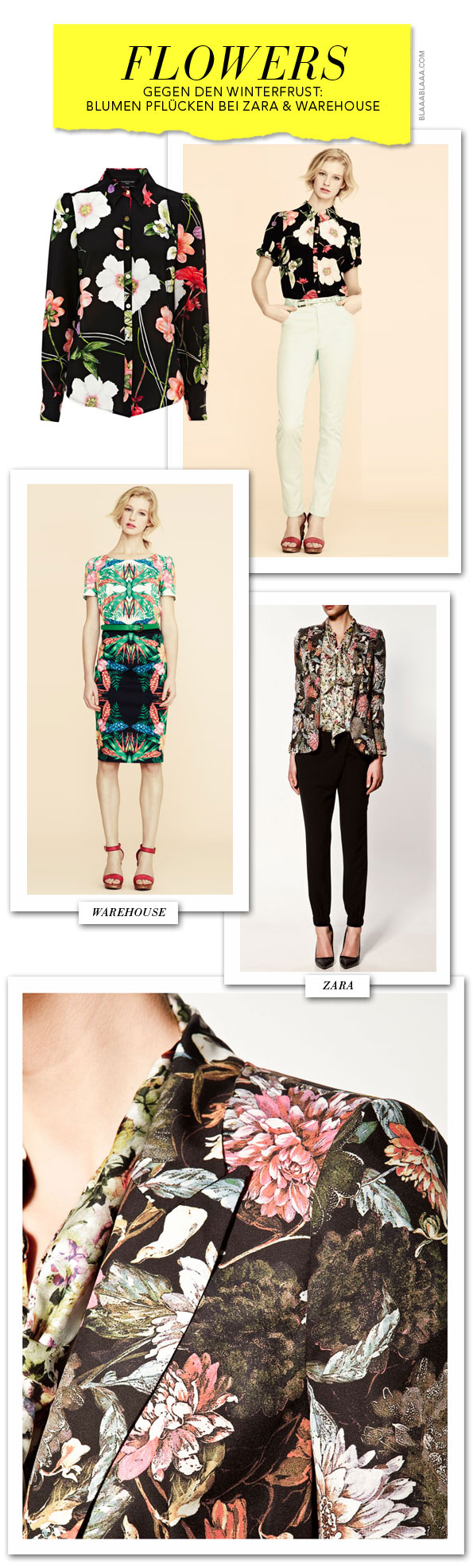 Na gut, wir waren jetzt nicht gerade die grössten Fans des grossen Blumenprint-Trends, aber so funktioniert der Mensch: Nimm es ihm weg und er will es zurück. Und jetzt gerade wollen wir die Blumen zurück! Am liebsten draussen, ach, Blumen!, Grün!, Blüten!, Leben!, Wärme!, OMG, wir sind definitiv stark unterblumt! So, ganz ruhig, einatmen, ausatmen, und einen tiefen Blick nehmen. Und dann vielleicht bestellen und/oder zu Zara gehen. Jep, im Notfall ist es immer ganz gut, wen man weiss, wo die Blumen sind.