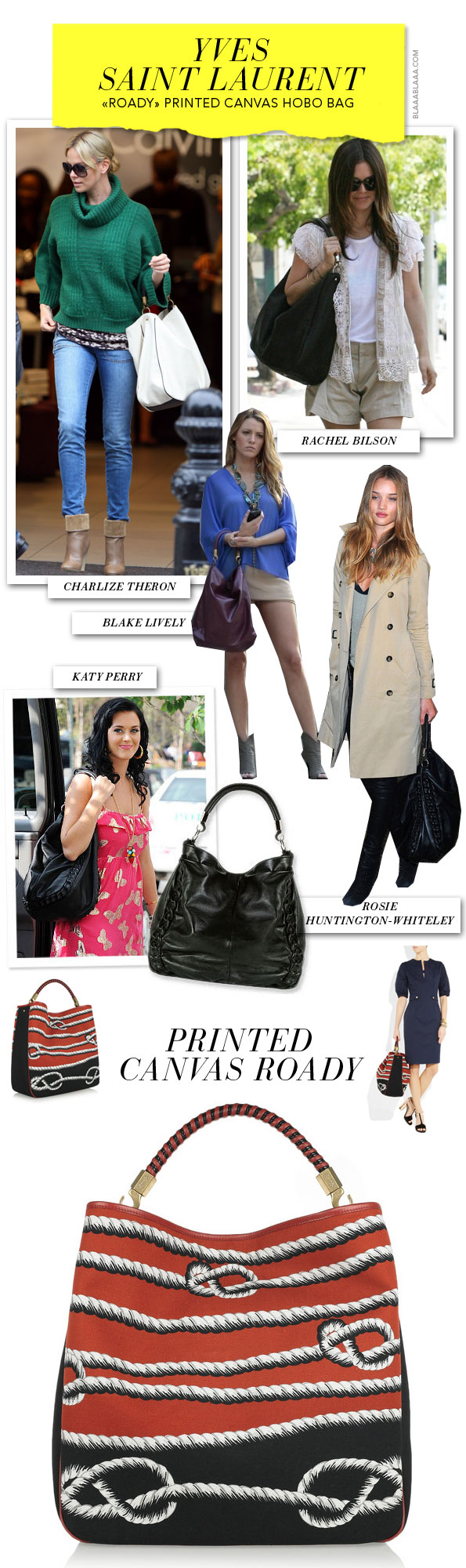 Die «Roady» von Yves Saint Laurent, designed by Creative Director Stefano Pilati, debütierte im Herbst/Winter 2009/2010 in der Werbekampagne mit Christy Turlington und ist seither in aller Promi-Armbeuge, z.B. bei Charlize Theron, Rosie Huntington-Whiteley, Blake Lively, Rachel Bilson, Katy Perry, Fergie, Mary Kate Olsen, Kylie Minogue, Tilda Swinton etc. Okay, geschenkt hätten wir sie natürlich genommen, aber besessen waren wir nicht gerade. So. Und dann kam die Seemanns-Variante und jetzt haben wir echt nen Knopf, hallo, 900 Euro für ein Stück bedrucktes Segeltuch?!? Und … mahh, wir lieben es! OMG, sie ist so schööön! Die Farben! Das Knoten-Sujet! Der Griff! Tja, Liebe und Verstand verstehen sich eben schlecht …