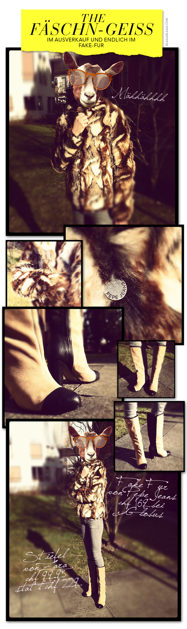 Jauu, die Fäschn-Geiss war im Ausverkauf und hat sich endlich, endlich einen Fake-Fur zugelegt. Und zwar von Pepe-Jeans im Globus, runtergesetzt von Keine-Ahnung-mehr auf CHF 169.–, aber die falschen Pelze hängen überall a bissi rum, z.B. bei H&M für CHF 55.– etc., Darling, krall dir einen, das ist viel Warm für wenig Stutz und du bist auch immer grad rausgeputzt! Und die Nude-Schwarz-Stiefel von Zara gibt’s jetzt für CHF 99.95 statt 229.–, oh yeah! Warum das Verkaufspersonal einen da aber immer behandelt, als hätten sie alle einen Abschluss in Raketenwissenschaft und 4 Nobelpreise hinter der Kasse, das weiss man nicht. Määähhh!