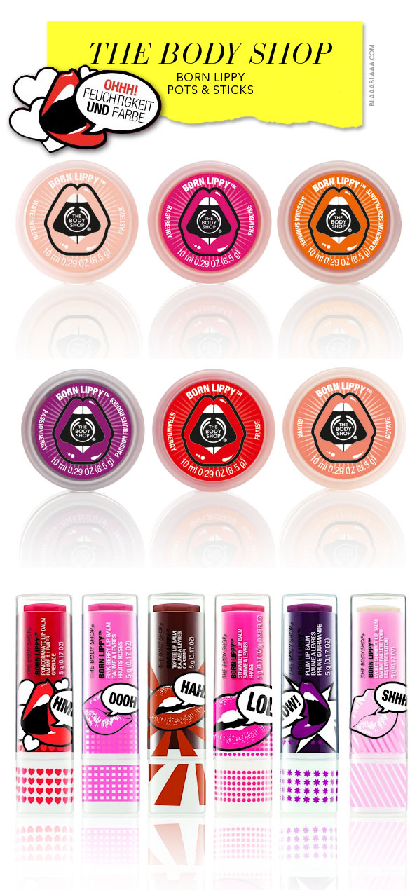 HMM, OOOH, HAHA, LOL,WOW und SHHH? Nene, eigentlich müsste auf den berühmt-berüchtigten Lippenpomaden von The Body Shop stehen: DAT KANN MAN NICHT ESSEN! Oder eben doch. Das ist wie früher beim Pritt-Stift, der so fantastisch nach Marzipan roch, ja, wir sind auch erwachsen geworden, obwohl wir mindestens 5 davon gegessen haben. Erwachsen? Okay, sagen wir, wir sind gross geworden. Und gross ist auch die Fan-Gemeinde der Born Lippy Pots, die es jetzt neu eben auch als Sticks gibt, damit man nicht immer gleich den Finger noch abschleckt, HMM, OOOH, HAHA, LOL,WOW und SHHH. Oder einfach: HMMMMMM!