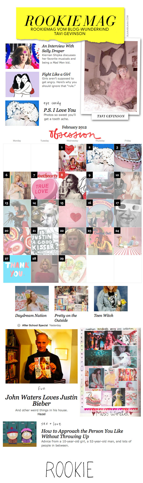 Tavi, das Online-Wunderkind, das mit 11 mit ihrem «Style Rookie»-Blog bereits für Furore sorgte, ist jetzt süsse 15 und nun auch Gründerin und Chefredaktorin von RookieMag.com, «a new site for teenage girls». Das Geniale daran: Es erklären nicht nur alte Säcke den Teenies die Welt, sondern es gibt z.B. Ratschläge «from a 10-year-old girl, a 52-year-old man, and lots of people in between». Aufgebaut ist das Ganze monothematisch, also pro Monat alles rund um ein Thema, passend zum Valentinstag ist es im Februar «Obsession», und dazu gibt’s von den rund 50 Mitwerkelnden, wovon etwa 5 volljährig sind, täglich News. Wirklich toll gemacht! Und nein, nicht nur «for teenage girls», OMG, da erklären einem 10-Jährige die Welt. Und die machen das auch noch gut!