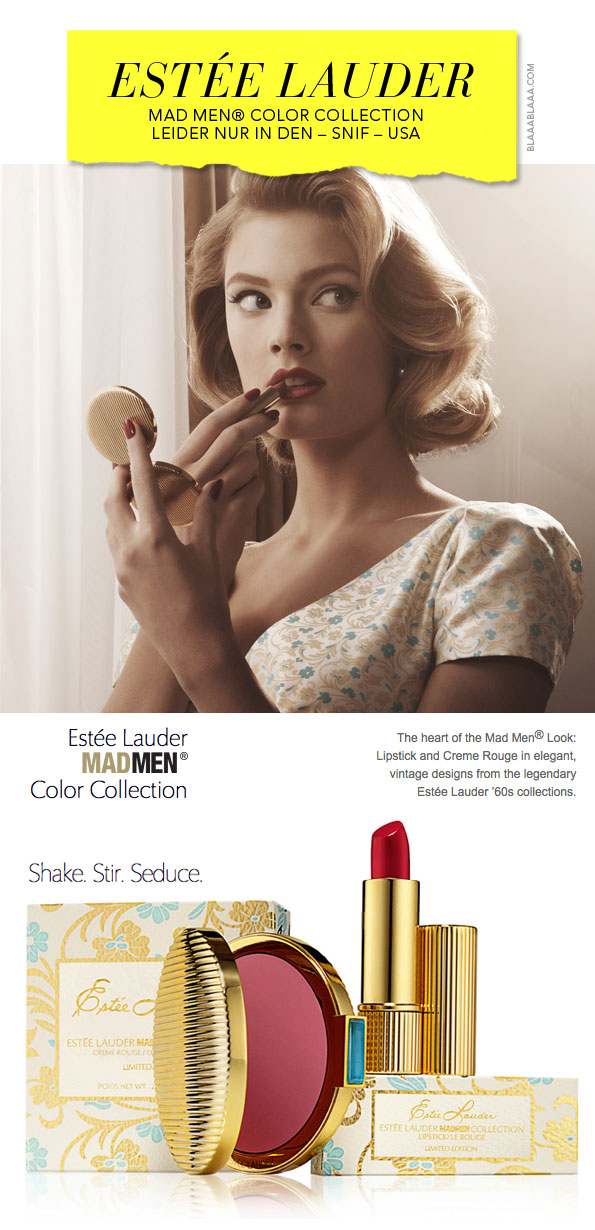 Shake. Stir. Seduce. Aber gerne doch, her mit dem «Lipstick and Creme Rouge in elegant, vintage designs from the legendary Estée Lauder ’60s collections», aber dat kriegt man ja mal wieder nur in the USA, ach nee, wir gründen jetzt dann eine Ich-will-online-bestellen-und-euch-mein-Geld-geben-gopferdelli-warum-denn-nicht-auch-in-Switzerland-Selbsthilfegruppe! So. Und jetzt brauchen wir einen Geschüttelten. UND einen Gerührten.