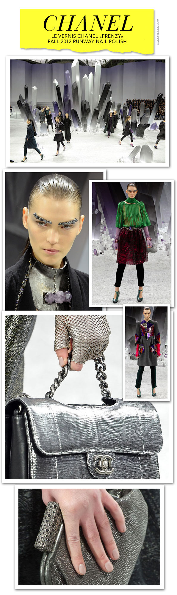 Uhh, da gab’s ne Menge Unerwartetes bei der Chanel Fall 2012 Show, Karl macht auf The-New-Style, viel Materialmix, er hat den Dreiteiler Jacket-Rock-Hose (und zwar Rock-über-Hose, ähä) zurückgeholt, es gab Riesen-Kristalle, Glimmer-Glitter-Augenbrauen, es schimmerte und glitzerte und glimmerte und, ah, 1 x HYPERVENTILIEREN, die Nägel? Die Nägel? Die Nägel? Ein «Lavendel-Taupe-Grau-Hybrid». Peter Philips, Chanel Global Creative Director, verriet schon mal den Wahnsinns-Namen, sag hallo zu «Frenzy», dem «very beautiful, delicate pastel». Ja, schon schön. Aber, maaah, schon wieder ein Nude. Dabei hätten wir so gerne hyperventiliert.