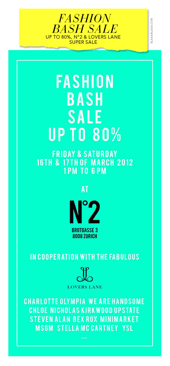 N°2 & Lovers Lane Fashion Bash Sale, up to 80%, Freitag, 16. & Samstag, 17. März 2012, 13 bis 16 Uhr, Brotgasse 3, 8008 Zürich, www.numbertwo.ch, www.loverslane.ch