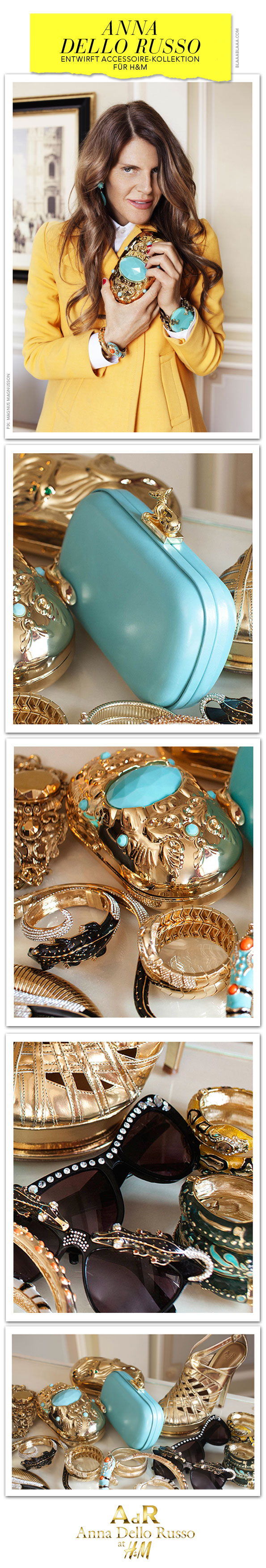 Yeah, yeah, yeah, das wird ja noch besser beim Schweden am Accessoire-Gestell, die wunderbar durchgeknallte «You can never be overdressed or overeducated»-Queen Anna Dello Russo hat für H&M eine sensationelle Accessoire-Kollektion, die Schmuck, Sonnenbrillen, Schuhe, Taschen und einen Trolley umfasst, entworfen! «Ich wollte kunstvolle Accessoires schaffen, die sonst nicht zu finden sind. Als Stylistin weiss ich, dass es vor allem auf die Accessoires ankommt: Erst sie verleihen einem Outfit die individuelle Note. Mit diesen Stücken kann jeder Spass haben und einen gewöhnlichen Tag in einen fantastischen Fashion-Day verwandeln», sagt Anna Dello Russo. Liebe Anna, dein Wunsch ist uns Befehl. Sehr scheeen!