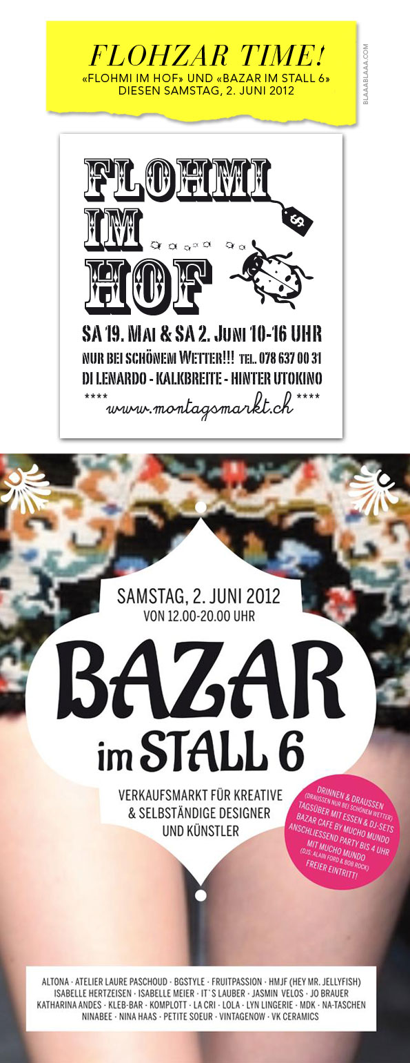 «Bazar im Stall 6», Verkaufsmarkt für Kreative & selbständige Designer & Künstler, diesen Samstag, 2. Juni 2012, von 12 bis 20 Uhr, Gessnerallee 8, 8001 Zürich, u.a. mit Altona, Atelier Laure Paschoud, bgstyle, Fruitpassion, HMJF (Hey Mr. Jellyfish), Isabelle Hertzeisen, Isabelle Meier, It`s Lauber, Jasmin Velos, Jo Brauer, Katharina Andes, kleb-bar, Komplott, La Cri, Lola, Lyn Lingerie, MDK, na-taschen, NinaBee, Nina Haas, Petite Soeur, Vintagenow, VK ceramics, stall6.ch