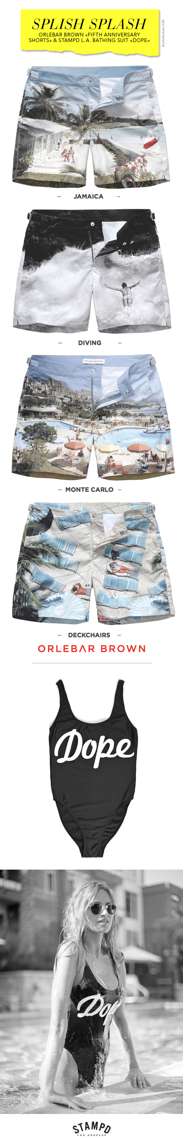«Fifth Anniversary Shorts» für Ihn und «Dope» für Sie, die Jubiläum-Shorts von Orlebar Brown mit verschiedenen Prints zu €215.– auf www.orlebarbrown.de, das California Classic One Piece Bathing Suit «Dope» von Stampd aus L.A., gesehen zu $65.– bei www.stampdla.com