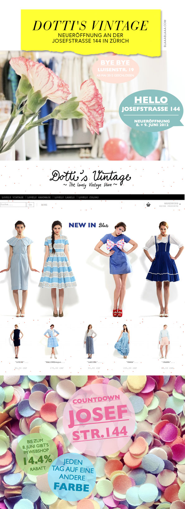 Wie der Dotter aus der Schachtel macht Zürichs unangefochtene Vintage-Königin «Dotti’s Vintage» Platz in ihrem Umzugs-Chaos und präsentiert ab Freitag, 8. Juni 2012, mit Stölzchen ihr neues Lädeli an der Josefstrasse 144 in Zürich. Alle, die vorbeischauen, erwartet eine üppige Ladung Neues und neues Altes in Blau, an dem sich übrigens gerade der Dotti’s-Webshop erfreut. Wer rasch bestellt, kann noch von 14.4% Rabatt profitieren. Das nennen wir doch mal eine Punktlandung!