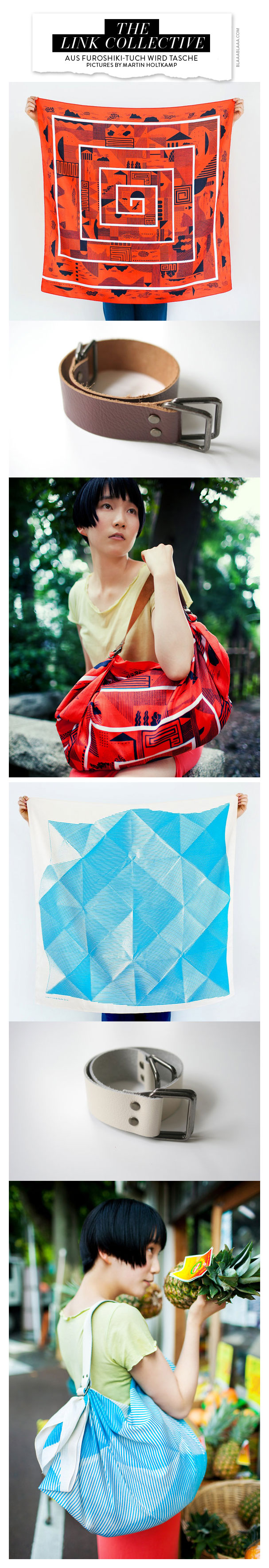 Aus Furoshiki-Tuch wird Tasche, das ganze Set (Tuch und Lederriemen) gibt es bei The Link Collective für $66 zu kaufen, www.etsy.com, thelinkcollective.com