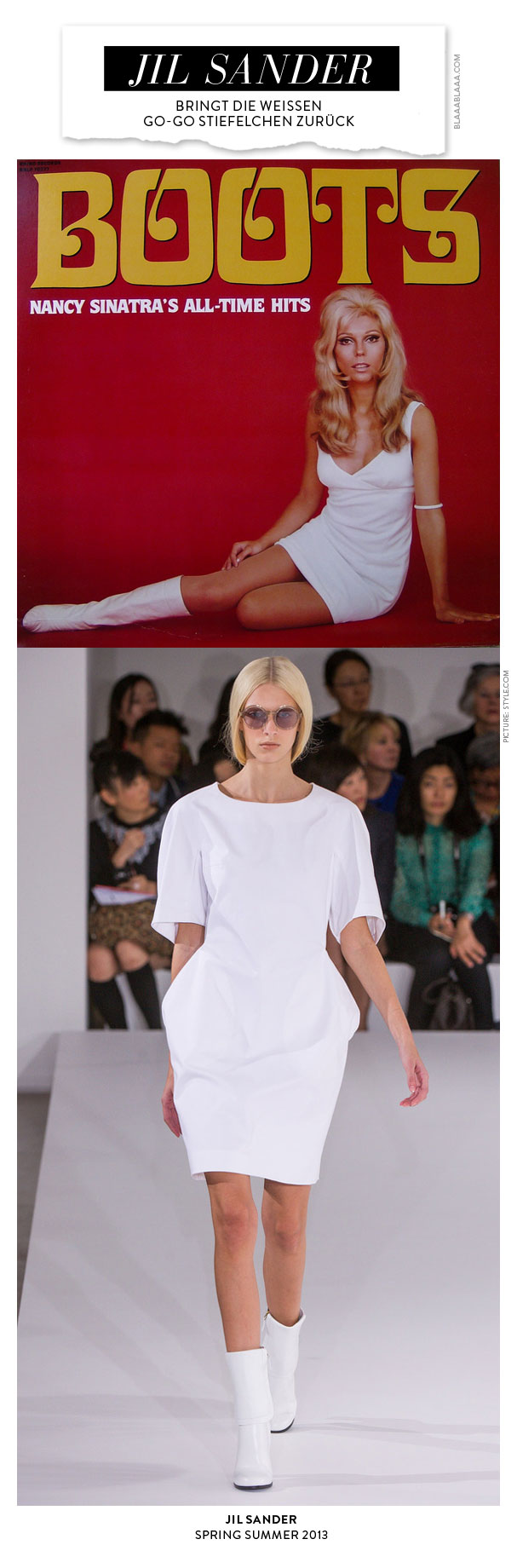 Das Go-go-Stiefel Comeback à la Nancy Sinatra, Brigitte Bardot, Twiggy und Konsorte, gesehen bei Jil Sander Spring Summer 2013, www.jilsander.com
