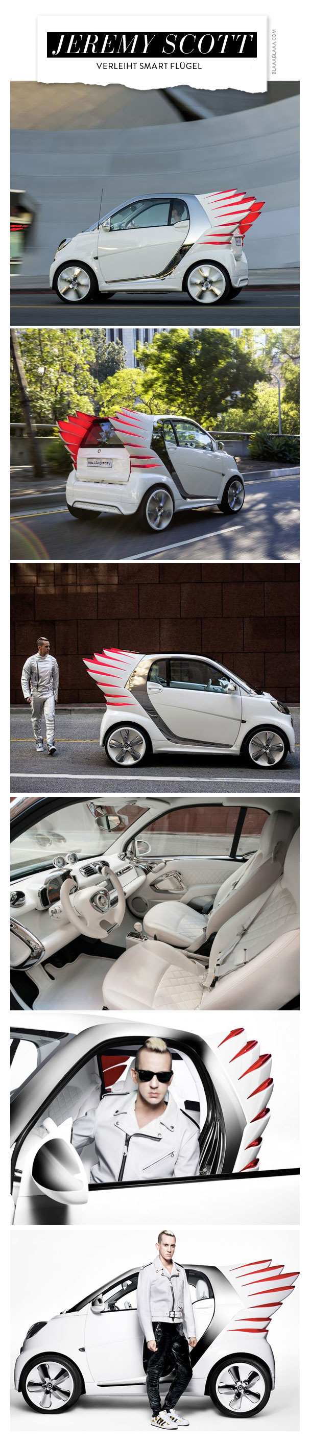 Dat der Jermey Scott nicht gerade flügellahm ist, war ja längst bekannt. Sein neuster Wurf: Eine elektrisierende Begegnung mit dem Hause Smart. Für die Autobauer aus good old Germany hat der quirlige Modedesigner dem Elektroflitzer «smart fortwo electric drive» Flügel und einen Satz avantgardistische Rückleuchten verpasst. Das Ergebnis: Ein emissionsfreier Engel auf vier Rädern und weil dat doch verdammt witzig aussieht, soll tatsächlich eine angepasste Version der seriennahen Studie ab 2013 auf hiesige Strasse kommen. Einfach himmlisch, Jeremy!