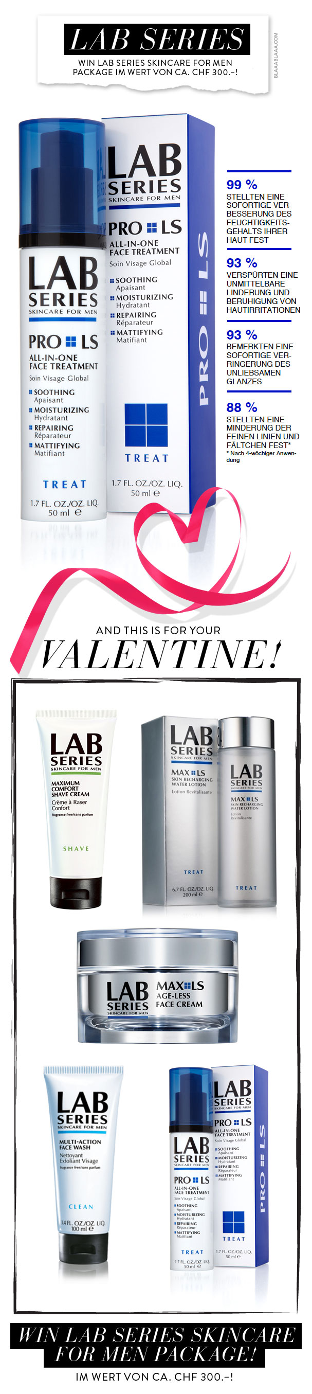 Lab Series Skincare for Men widmet sich seit langem ausschliesslich den individuellen Bedürfnissen der Männerhaut und präsentiert neu die geniale All-in-One-Gesichtspflege «PRO LS All-in-One Face Treatment», eine ölfreie Formel mit lindernder, feuchtigkeitsspendender, regenerierender und mattierender Wirkung, welche bei Rasurbrand, Spannungsgefühl, Hautschädigungen und öliger Haut hilft, für alle Hauttypen geeignet, erhältlich zu CHF 38.– ab 11. März 2013 landesweit in Kaufhäusern, ab sofort bei www.perfecthair.ch, www.labseries.com. Und damit du hier auch mal was für deinen Schatz abräumen kannst, yeah, Valentinstag, hol ihm das crazy LAB SERIES Skincare for Men Package mit «PRO LS All-in-One Face Treatment», «MAX LS Skin Rechargin Water Lotion», «Max LS Age-Less Face Cream», «Maximum Comfort Shave Cream», «Multi-Action Face Wash» plus Reiseset im Wert von ca. CHF 300.–, aber hallo!!!