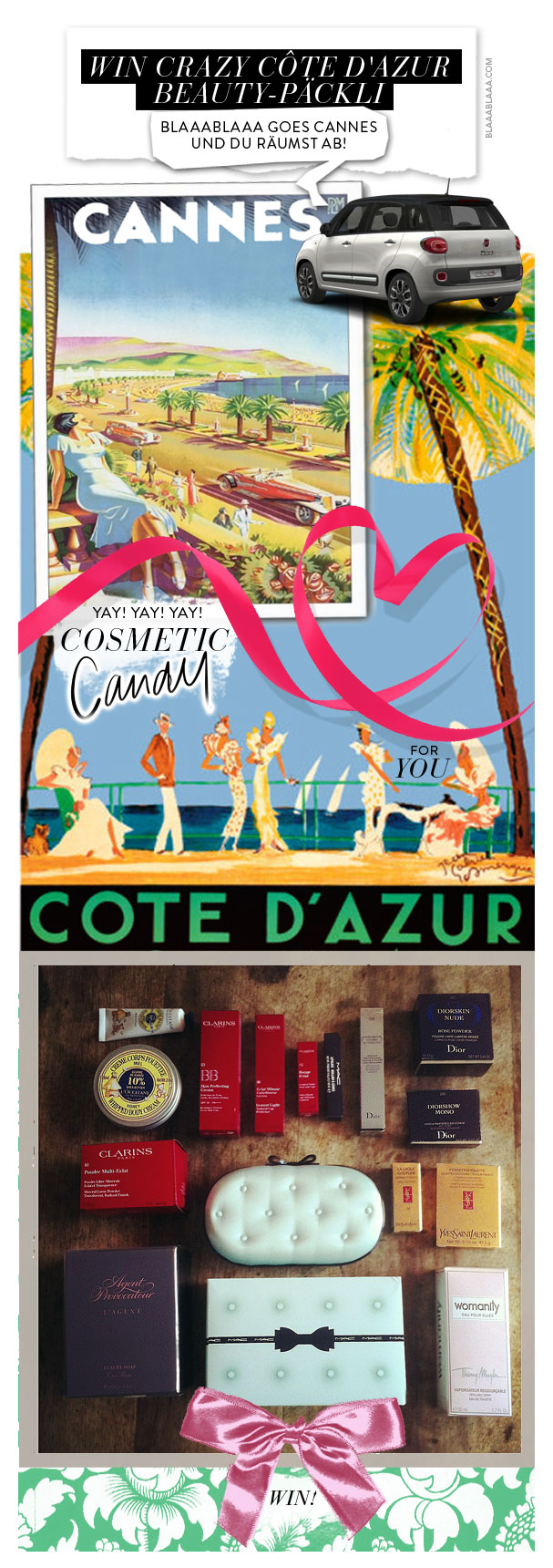 Enchanté! Yeah, yeah, yeah, BlaaaBlaaa ist dann mal Cannes, nö, nix Film, wir dürfen für Fiat nach Cannes fliegen, um ein neues Modell vom Fiat 500L zu testen! Wie? Das ist dir doch total schnurz? Moment, damit du auch was davon hast, und damit der Kosmetik-Tisch nicht wieder fast zusammenbricht, schnüren wir mit den Beauty-Samples ein Päckli für dich und nennen es, hmm, ähh, okee, the crazy Côte d’Azur Beauty-Pack! Hier geht’s zum Speck!
