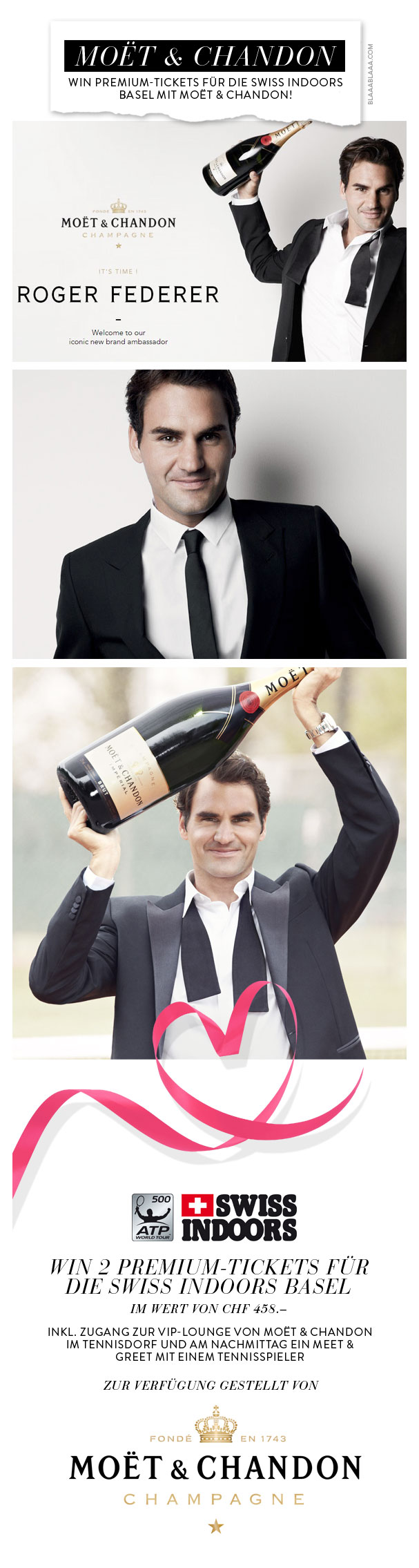 Schon seit mehreren Jahren ist Moët & Chandon, www.moet.com, der offizielle Champagner der renommiertesten Tennisturniere der Welt wie z.B. Roland Garros, ATP World Tour Finals, US Open, Shanghai, Bercy, Rom, Cincinnati und vielen anderen. Und mit dem Gentleman Roger Federer als Marken-Botschafter auf dem Platz wird Moët & Chandon nun auch der offizielle Champagner des grössten Tennisturniers der Schweiz: der Swiss Indoors Basel. Ja mei, und dat will jetzt doch gleich mal anständig begossen werden, darum lädt Moët & Chandon dich und Begleitung zu den Swiss Indoors nach Basel ein. Spiel, Satz und … Moët!