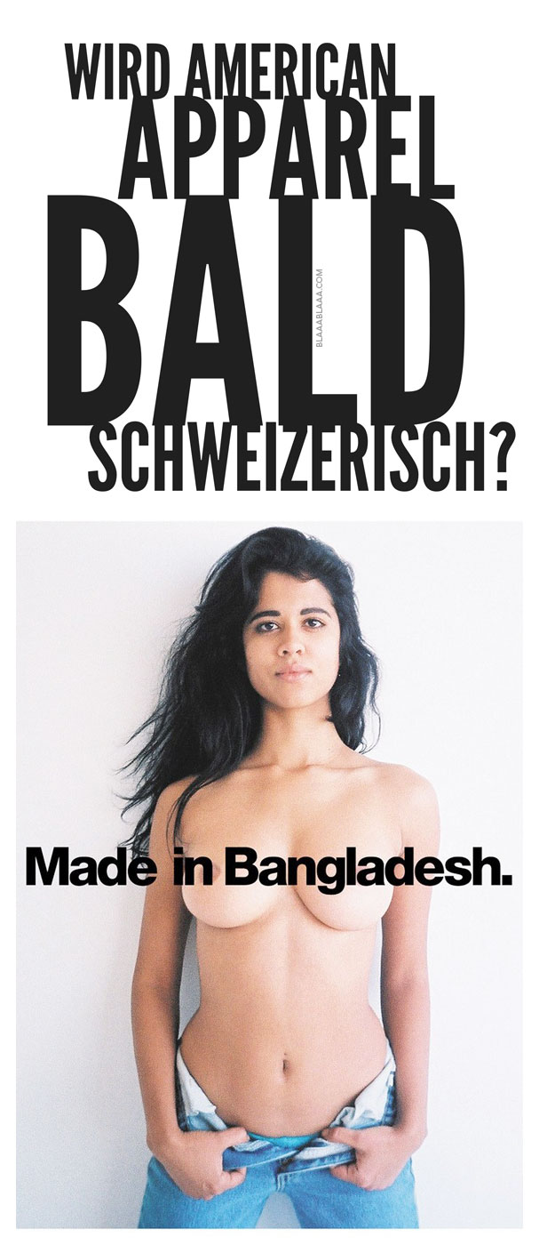 Das amerikanische Label American Apparel sorgt nicht nur mit nackten Tatsachen stets für ein bisschen Aufmerksamkeit, sondern kämpft auch seit längerem gegen den kreisenden Pleitegeier. Da kommt doch eine kleine Finanzspritze «Made in Switzerland» wie gerufen. Laut einer Mitteilung der US-Börsenaufsicht SEC hat sich die mit steuergünstigem Sitz in Pfäffikon/SZ ansässige FiveT Capital AG mit 11,54% am kalifornischen Unternehmen aus Los Angeles beteiligt. Ob es in Zukunft auch noch ein paar Prozente mehr sein dürfen, ist bis dato nicht bekannt, auf jeden Fall würde Dov Charney, der Cheffe und Gründer von American Apparel, mit Sicherheit sein letztes Hemd gegeben und damit einmal mehr für mächtig nackte Tatsachen sorgen.