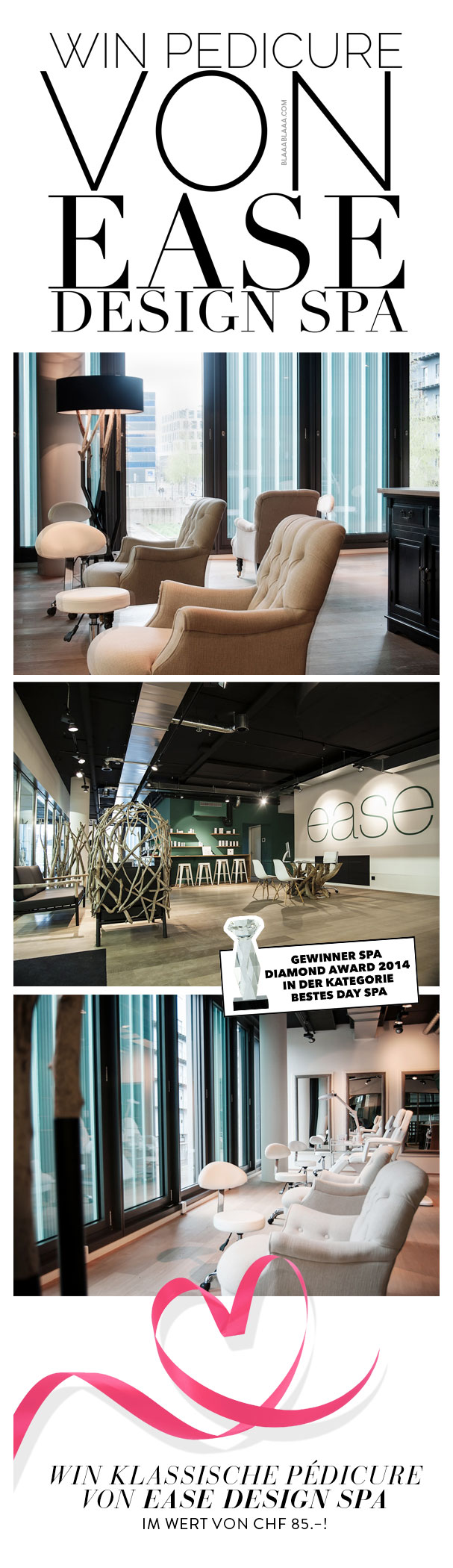 Das ease DESIGN SPA im Puls 5 gehört mittlerweile zur festen Grösse unter Zürichs schönheitsbewussten Verwöhnoasen. Aber halt, es kommt für die Herren Inhaber Pascal Stalder, Lukas Renggli und Stefan Witzig noch besser, denn nur gerade nach einem Jahr sind die drei Jungunternehmer vom deutschen Magazin «spa highlights» für den begehrten «SPA Diamond 2014» in der Kategorie «Bestes Day SPA» nominiert worden und mit Stolz wurde die Auszeichnung auch gleich mit in die Schweiz gebracht! Na bitte, die Herren, und weil «Mann» Preise gerne teilt, offeriert dir ease DESIGN SPA pünktlich zur Offenen-Schuh-Saison eine klassische Pédicure zum Geniessen. Parfait, Messieurs!