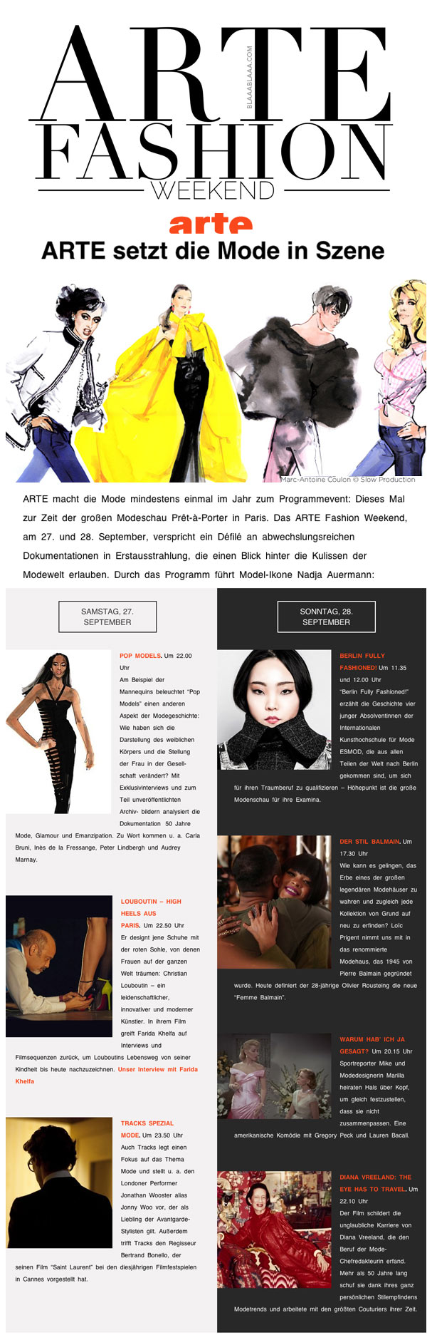 ARTE Fashion Weekend, dieses Wochenende 27. und 28. September 2014, mehr Infos und das ganze Programm unter www.arte.tv