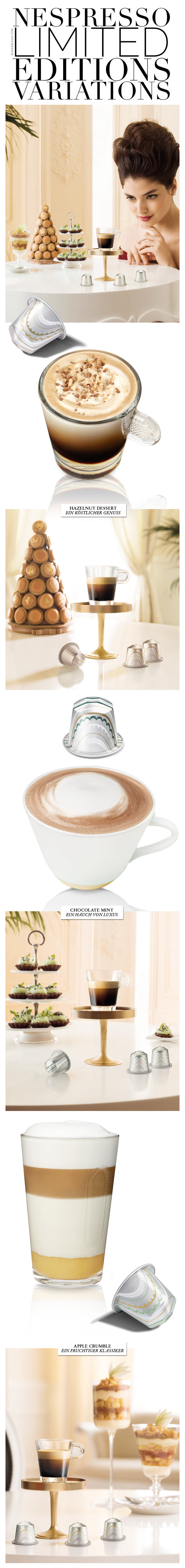 Zum Jahresende hält Nespresso für Coffee-Lovers drei spezielle Genussüberraschungen bereit. Von Desserts inspiriert bereichern die Limited Editions Variations das Kaffeevergnügen mit drei neuen Grands Crus: Hazelnut Dessert, Chocolate Mint und Apple Crumble. Für weitere süsse Versuchungen sorgen die Schokoladen-Carrés als exklusive Limited Edition. Und für die festliche Jahreszeit bieten Les Collections eine exquisite Auswahl an stilvollen Accessoires in limitierter Edition an.