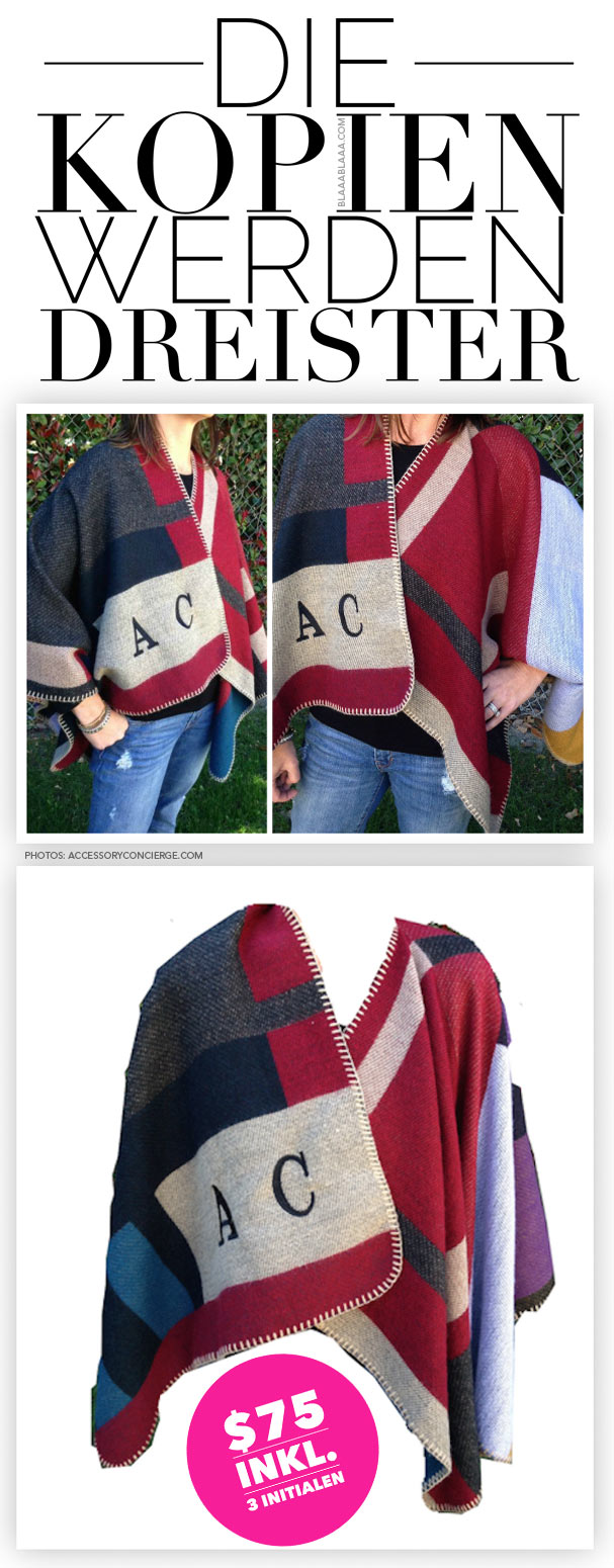 Na, na, na, mit den unzähligen Burberry-Poncho Interpretationen (siehe z.B. hier) liesse sich mittlerweile ein ganzes Album füllen. Ziemlich unverfroren gehen die Herrschaften des Onlineshops «Accessory Concierge» zu Werke: für mickrige $75 kann dort die sehr stark angelehnte Anlehnung an das britische Überwurf-Orginal inkl. dreier Initialen erworben werden. Ey, wenn die Qualität so toll ist, wie das Cape freigestellt wurde, dann: Aloha!