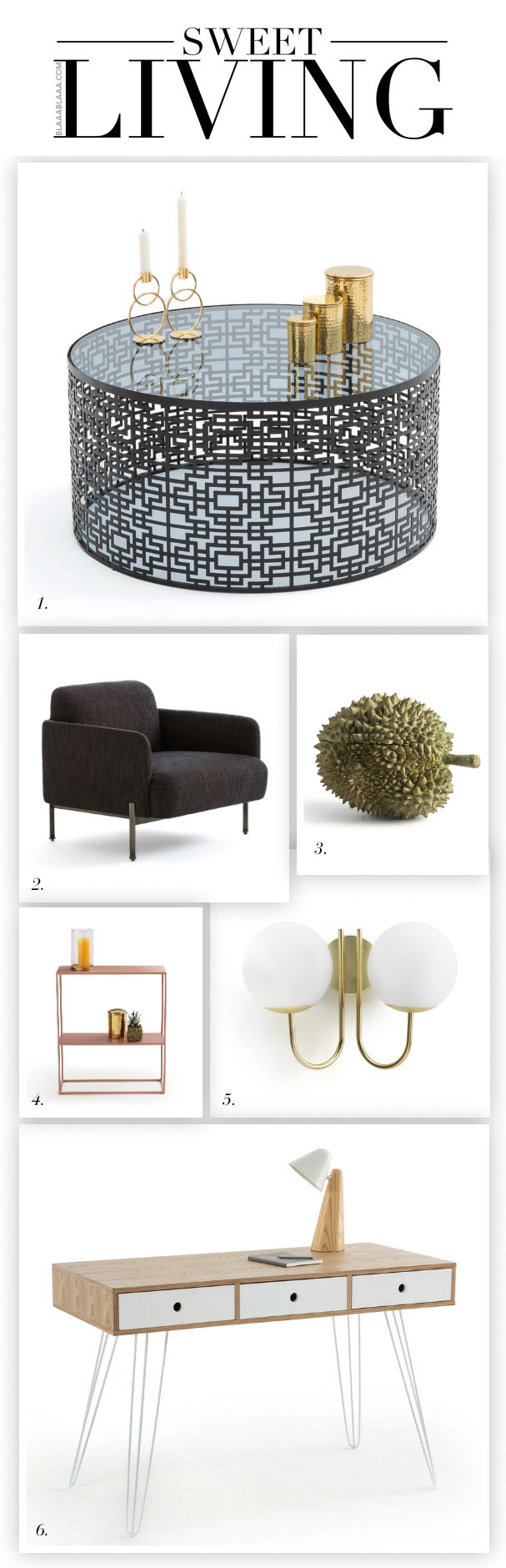 Du brauchst für dein zu Hause noch ein paar hübsche Hinkucker? Et voilà, wie wär’s z.B. mit dem Beistelltisch Gueishi aus Metall und mit Ajourmuster (siehe Nr. 1)?