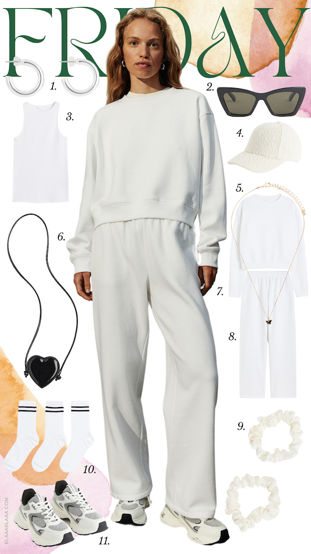Well, Schatz, mit der Sweatpants und dem Sweatshirt aus einer Baumwollmischung mit weich angerauter Innenseite (siehe Nr. 7 & 8) geht’s bequem durchs Wochenende!