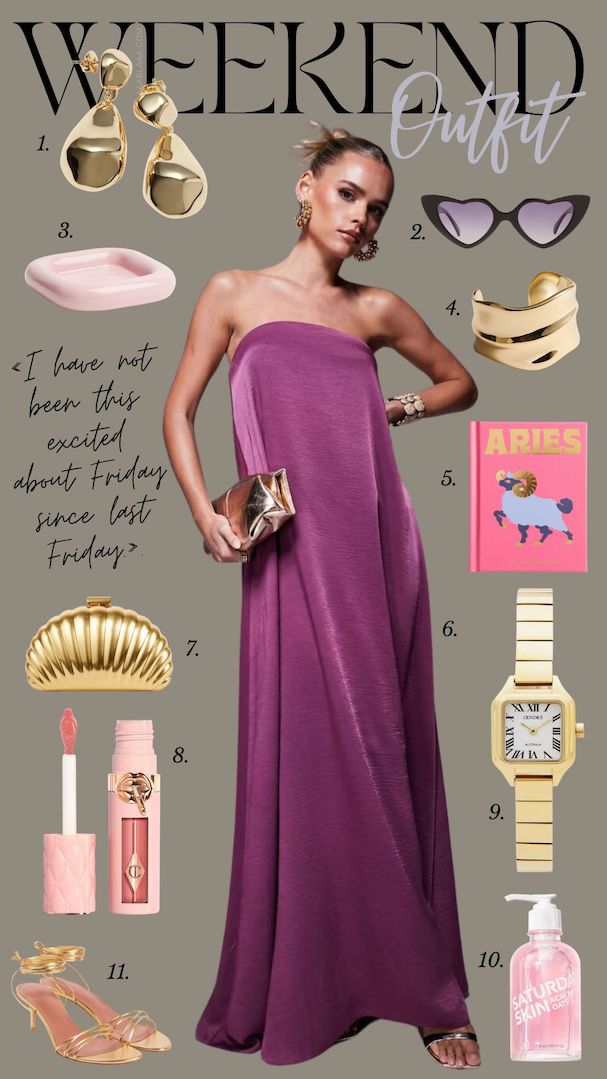 - ASOS DESIGN – Petite Bandeau Trapeze Satin Maxi Dress In Dark [Get It Here!] oder ASOS DESIGN – Petite Bandeau Trapeze Satin Maxi Dress In Chocolate [Get It Here!]